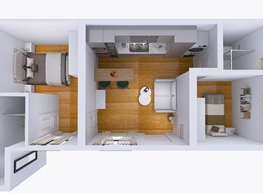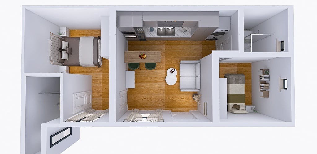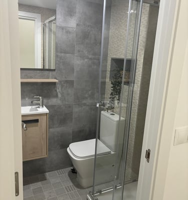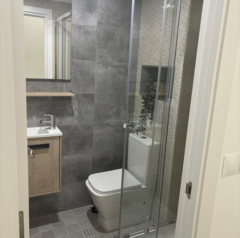 55m2, 2 dormitorios, 2 baños en suite, salón con cocina tipo americana,